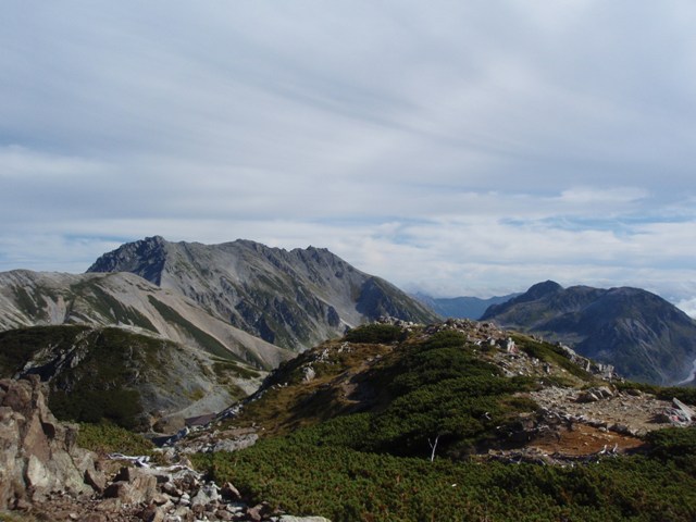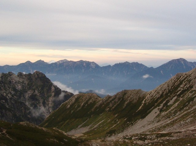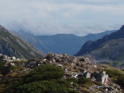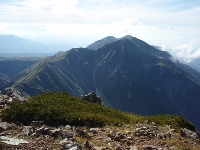 剣御前小屋(別山乗越)から別山尾根、前剣方面を望む、左奥:大日岳方面、右奥:剱岳山荘方面