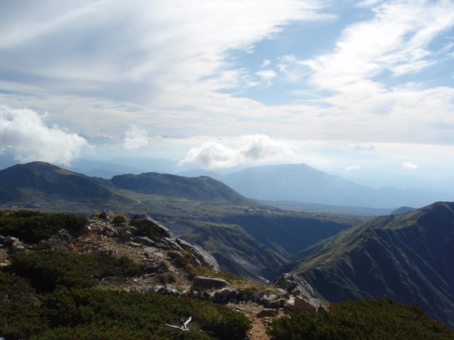 別山頂上付近から南方向 左上:雄山頂上、右:竜王岳(2872)から浄土山(2831)、中央:一の越、奥:木挽山(△2301)