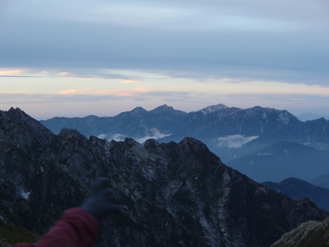 別山乗越の奥右に剱御前、正面室堂乗越の奥は西大谷山?から剱岳早月尾根