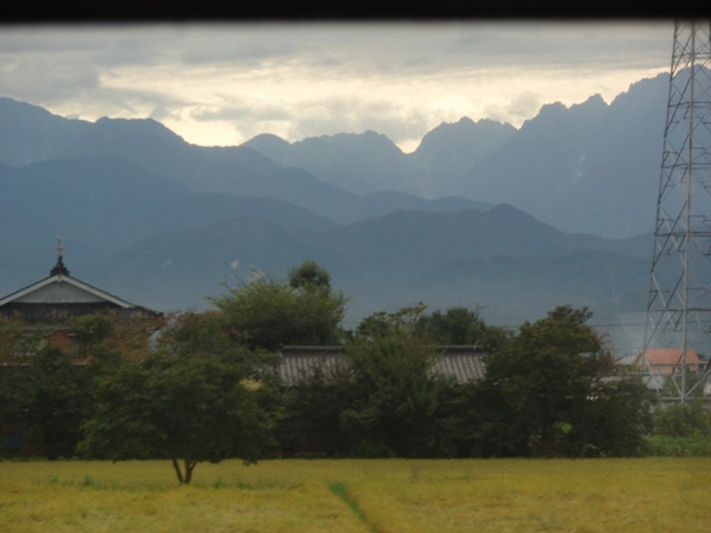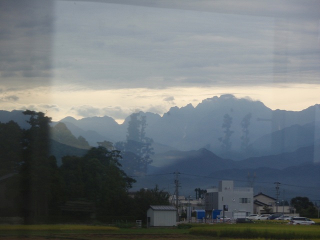 左から158毛勝三山、48剱岳、49立山、(中央)7:35