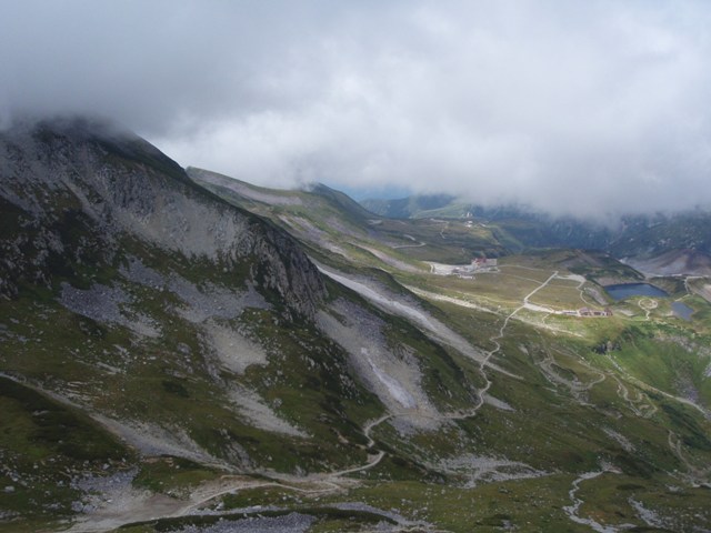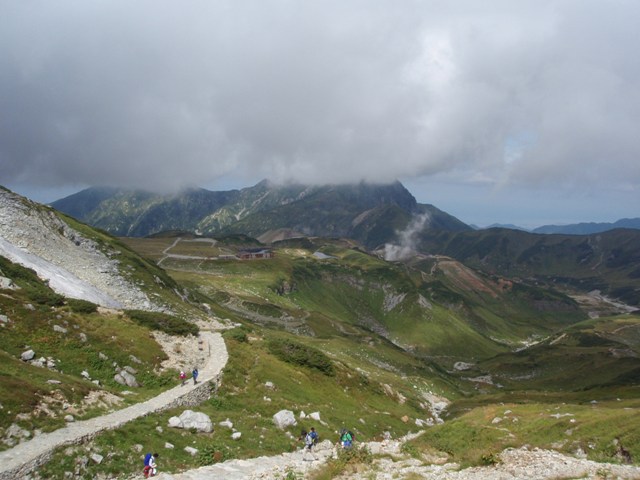 室堂平を振り返る・みくりが池・地獄谷、右下:雷鳥平・奥は159大日連山 10:20