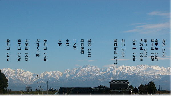 富山市婦中町から見た立山連峰、左から#158毛勝三山(毛勝山を除く)、赤谷山、剱岳、立山連峰。剱岳から左前に伸びているのが早月尾根、剱岳の右に前剣、雄山の手前は弥陀ヶ原。