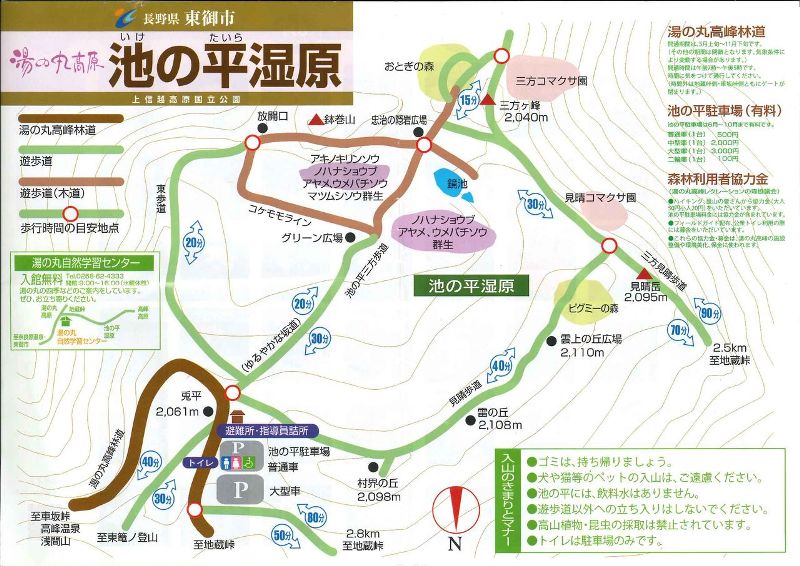 花の百名山の高峰高原の隣の湯の丸高原の池の平湿原は自動車で駐車場まで行くことができます。